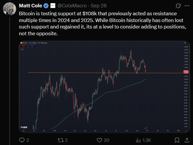 Strive Asset Management CEO Matt Cole posted this week about there being lots of fear in Bitcoin and treasury company markets at the moment. He argued that current levels offer attractive entries based on three charts: dollar weakness ahead, MSTR/Bitcoin ratio at yearly lows, and Bitcoin holding a strong historical support level of $108k.