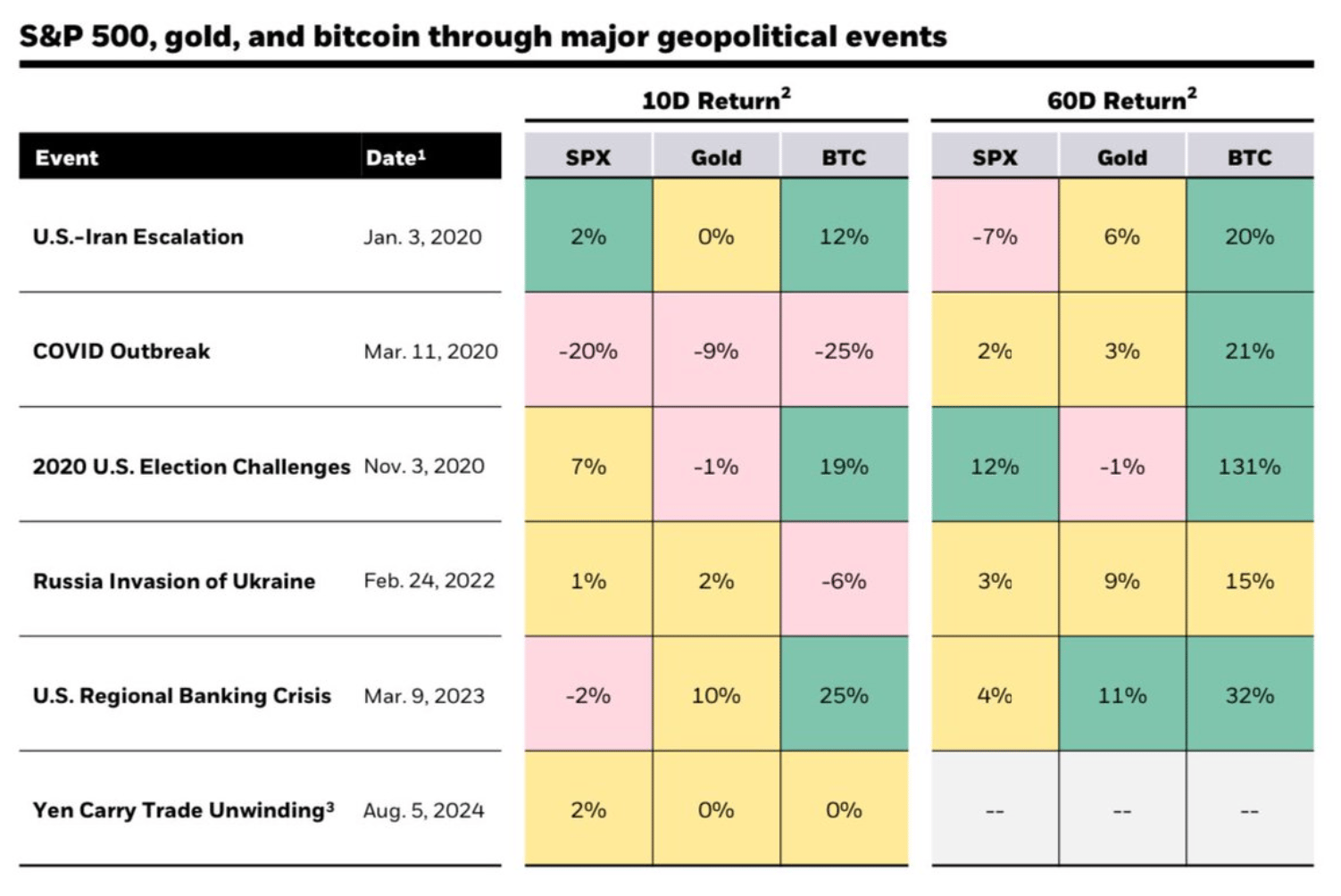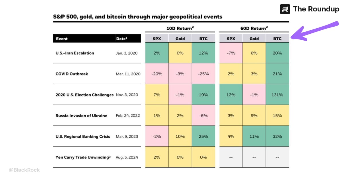 BlackRock's research tells the real story: After the 2020 US-Iran escalation, Bitcoin (the column on the right of the above image) was up 20% sixty days later. S&P 500 was down 7%. Gold up just 6%.