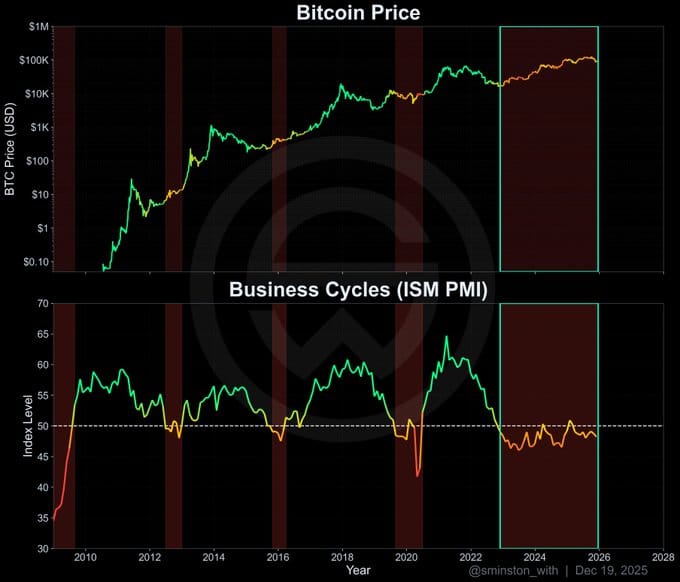 The chart making the rounds now is the ISM Manufacturing PMI overlaid with Bitcoin price. The correlation is striking.