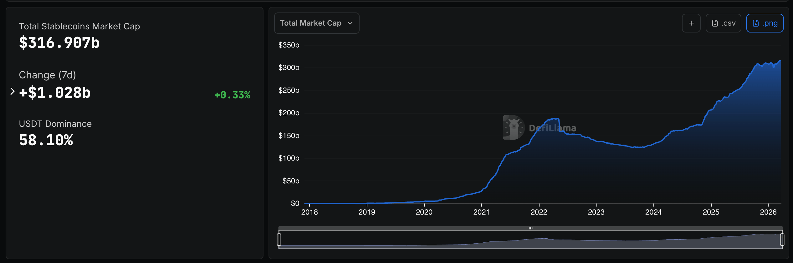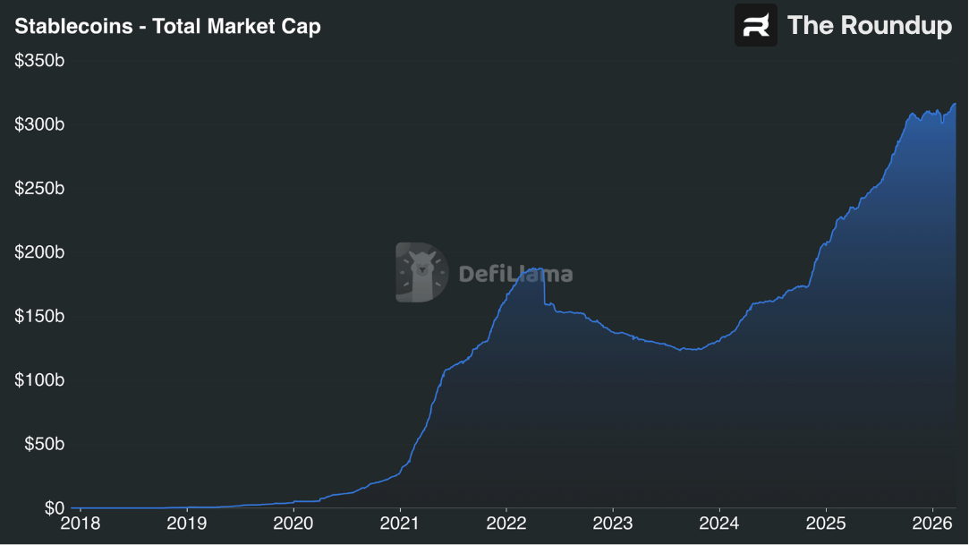 The total stablecoin market cap just crossed $316 billion (up 56% y.o.y).