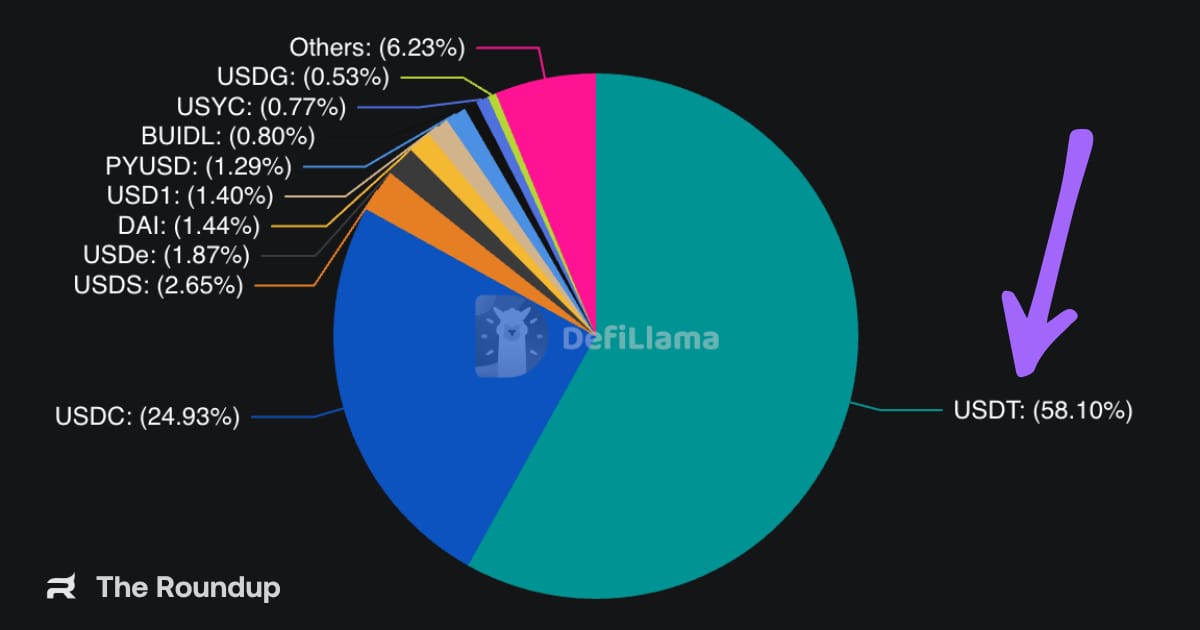 USDT dominance sits at 58%. More than half of all stablecoins controlled by one company, whose reserve audits have been subject to regulatory scrutiny for years.