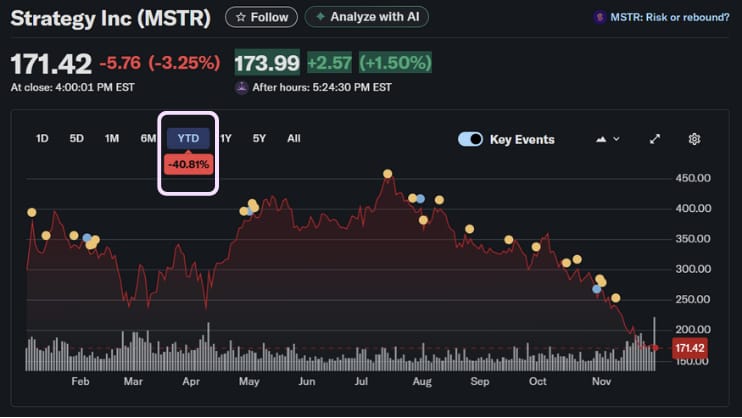 Saylor has pushed back, arguing Strategy is an operating company with a $500 million software business. But commentators increasingly believe removal is the base case. The stock is down 40.81% YTD while Bitcoin is down only 8%.